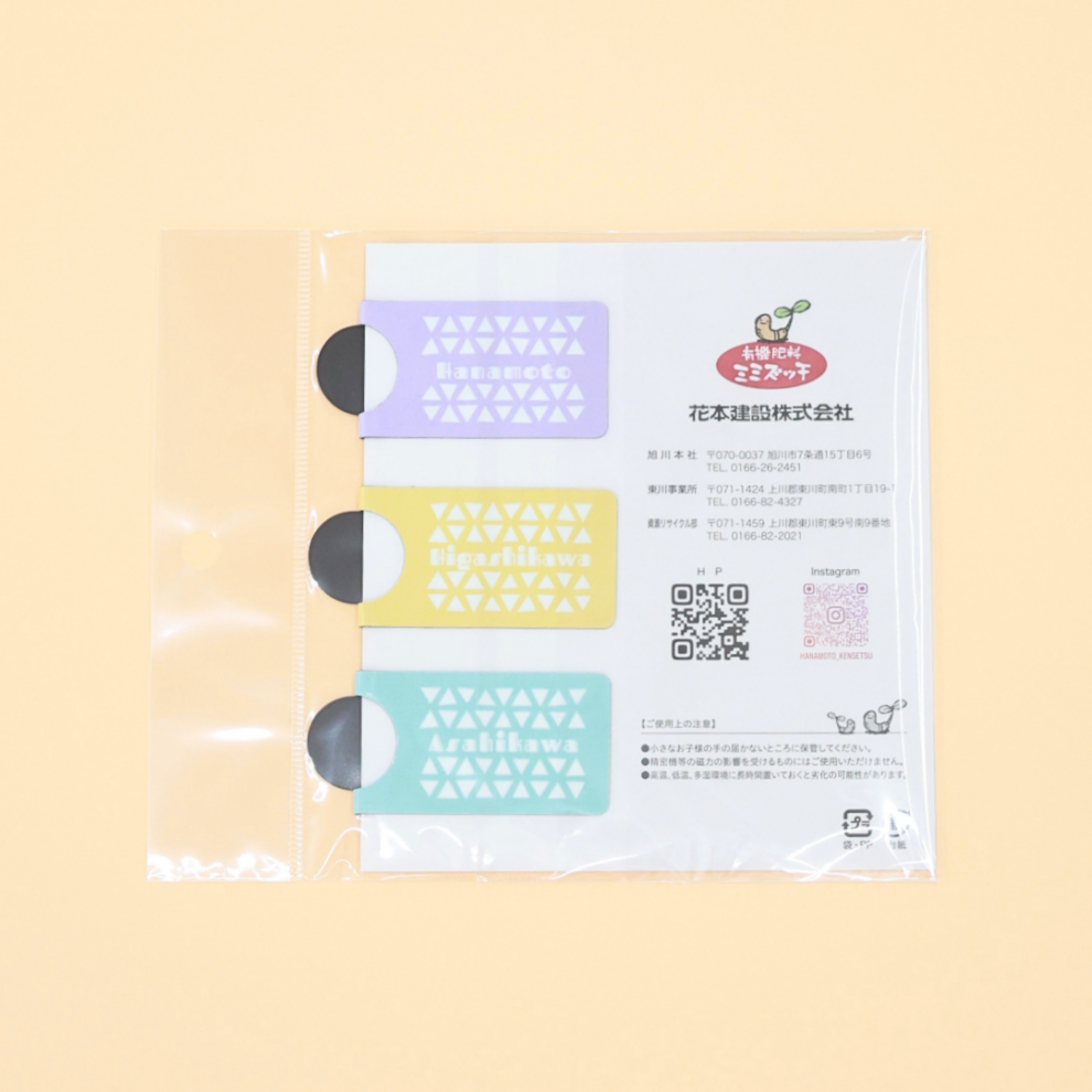 - 花本建設様のキャラクター「ミミズッチ」と、本社のある旭川市、事業所を構える東川町をイメージした「シマエナガ」「モモンガ」をモチーフに親しみやすいデザインに仕上げました。